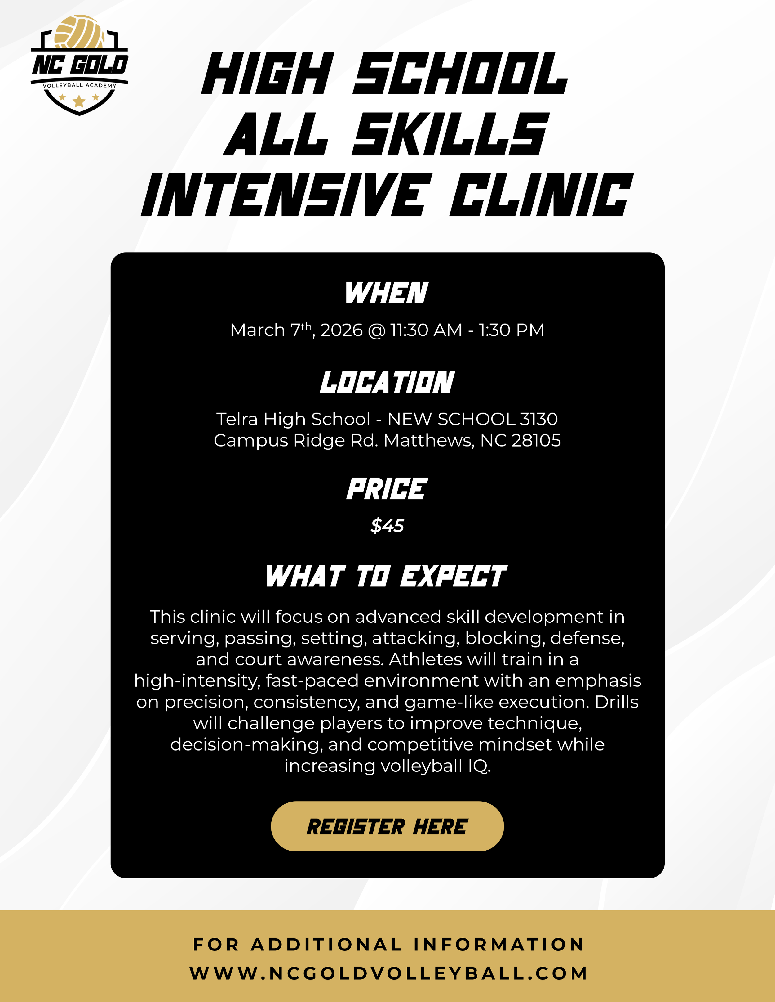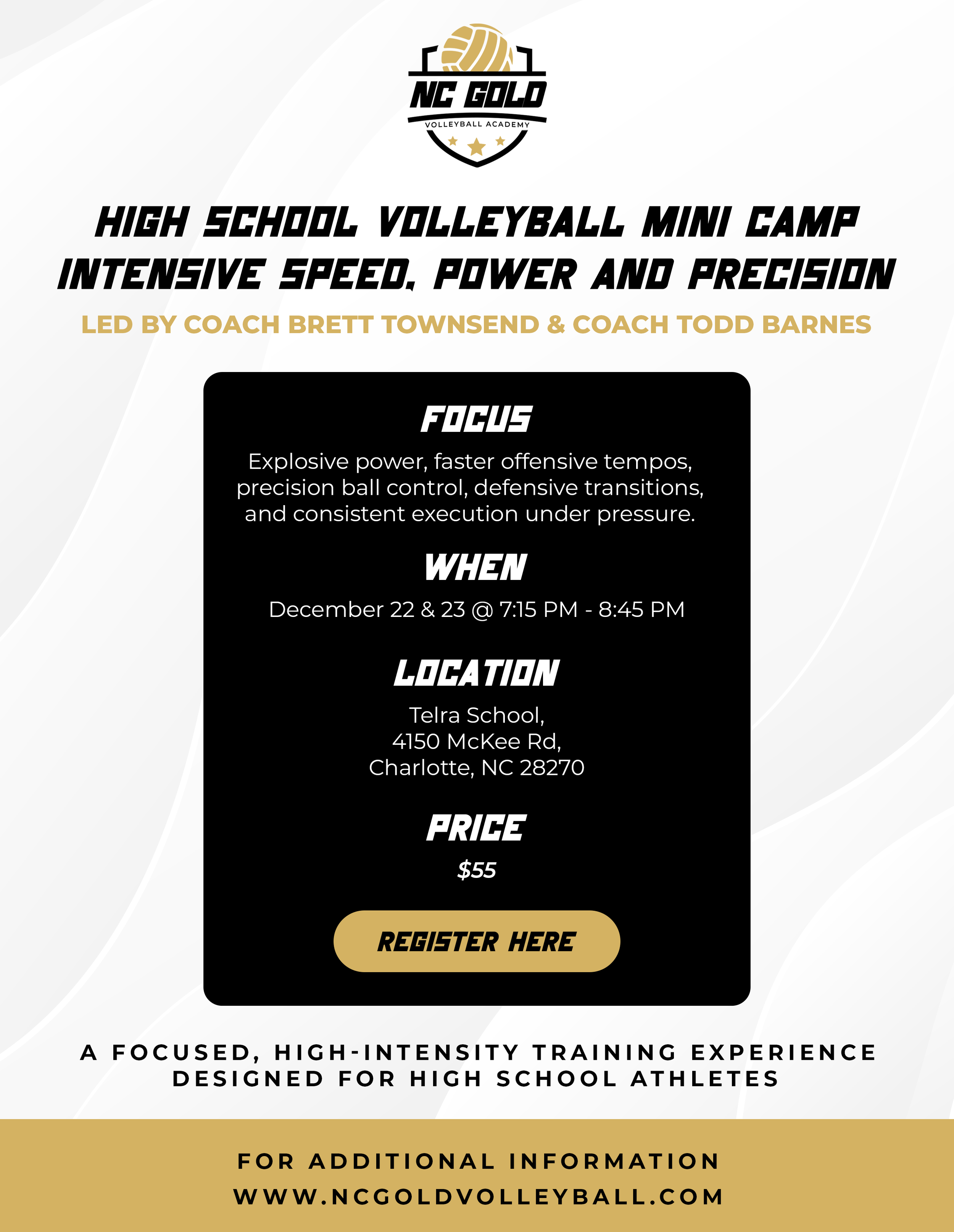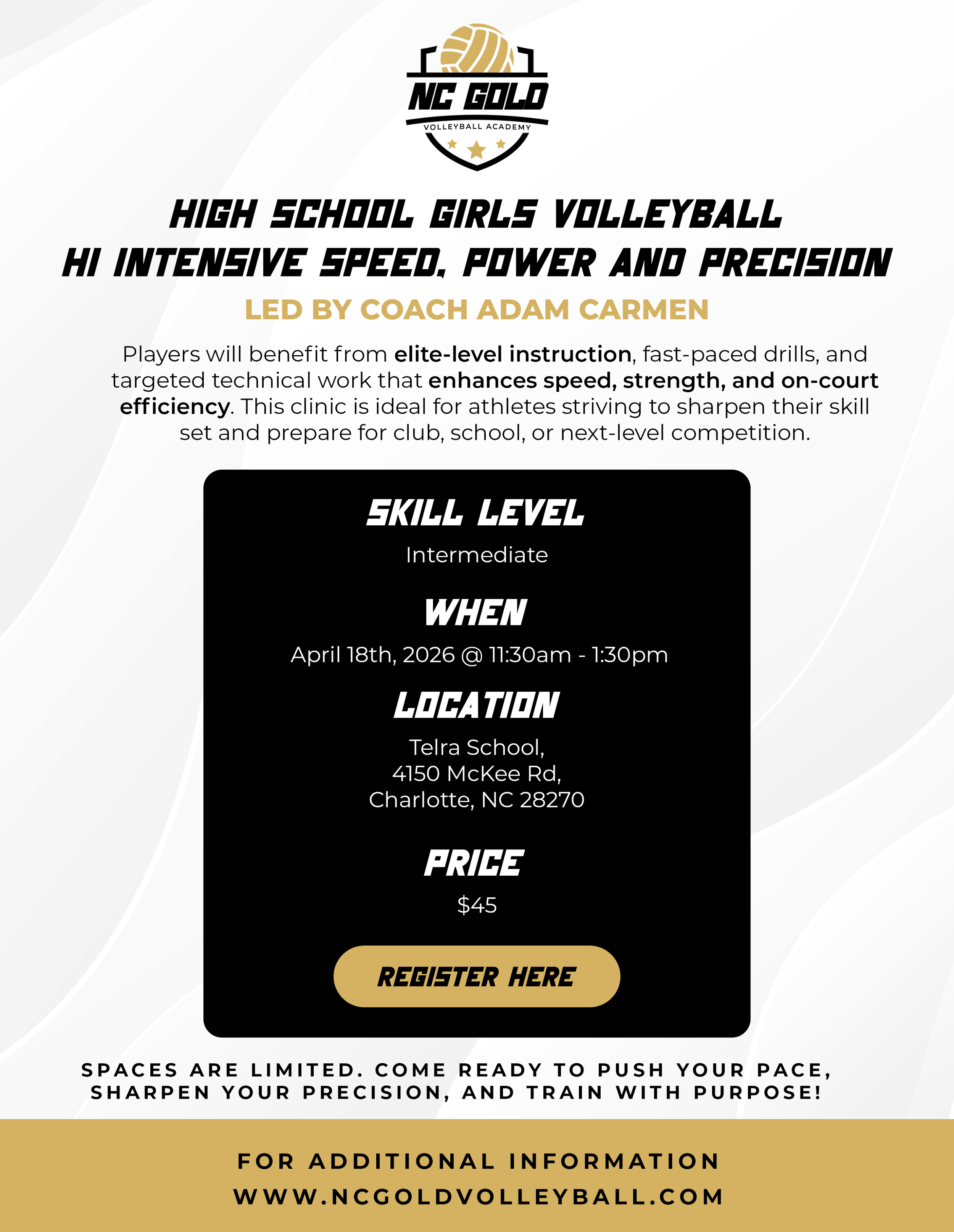 Charlotte's #1 answer to quality instruction, challenging competition, and wholesome recreational activity for ALL athletes at ALL levels. Come on HOME friends and neighbors NC GOLD VOLLEYBALL welcomes you.