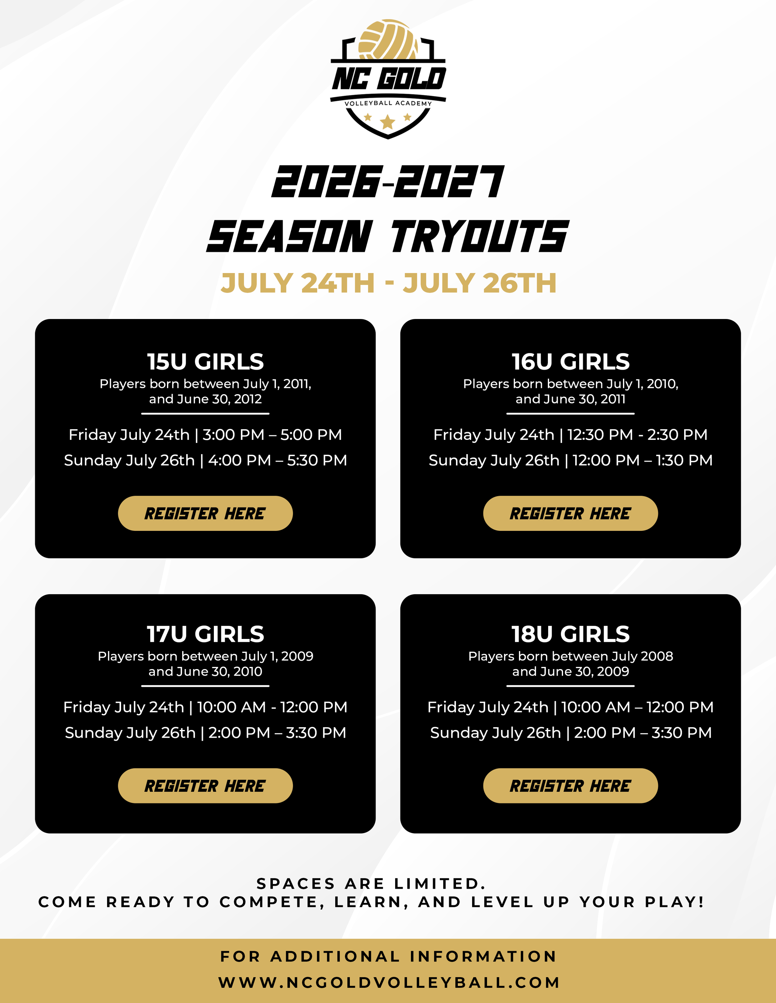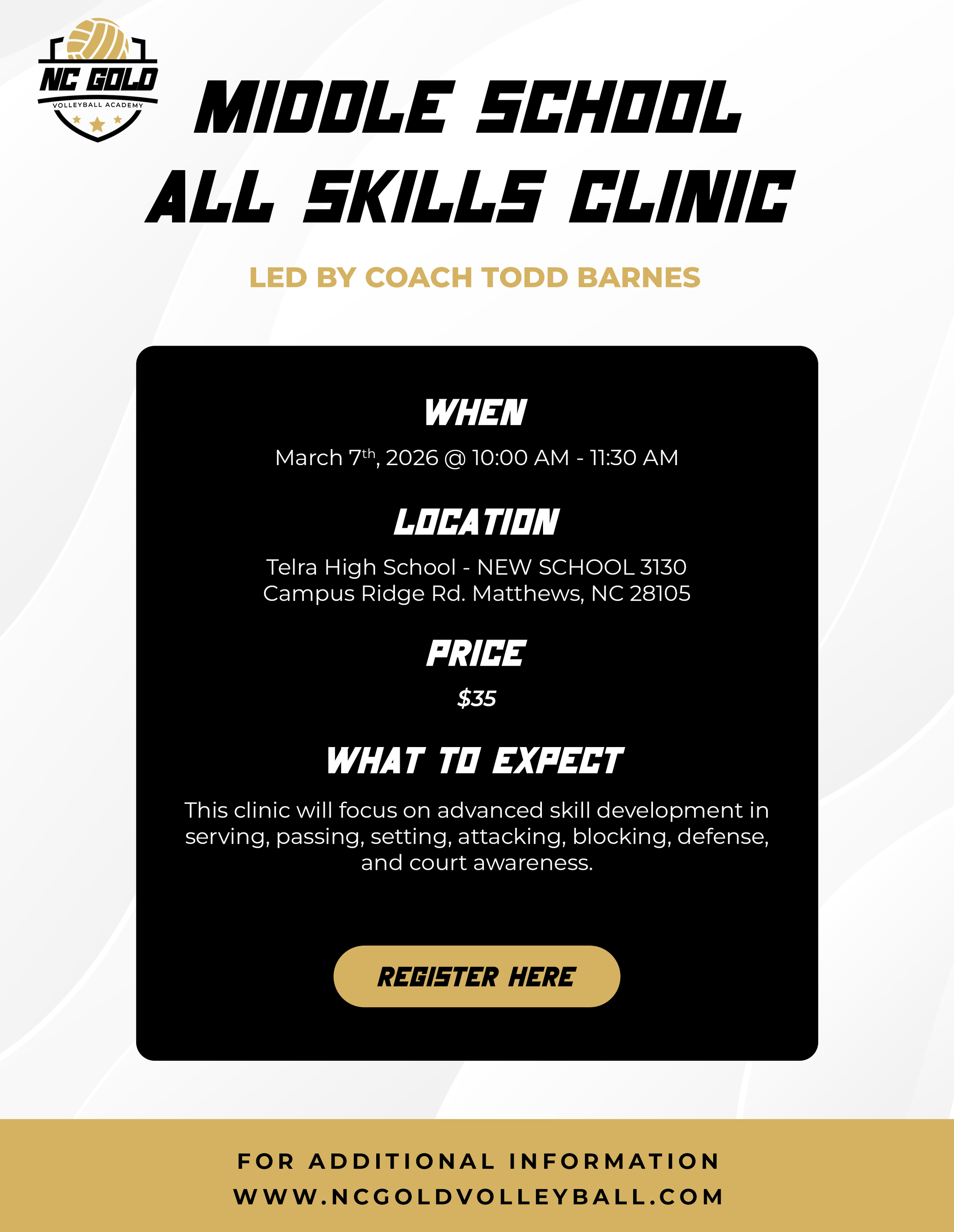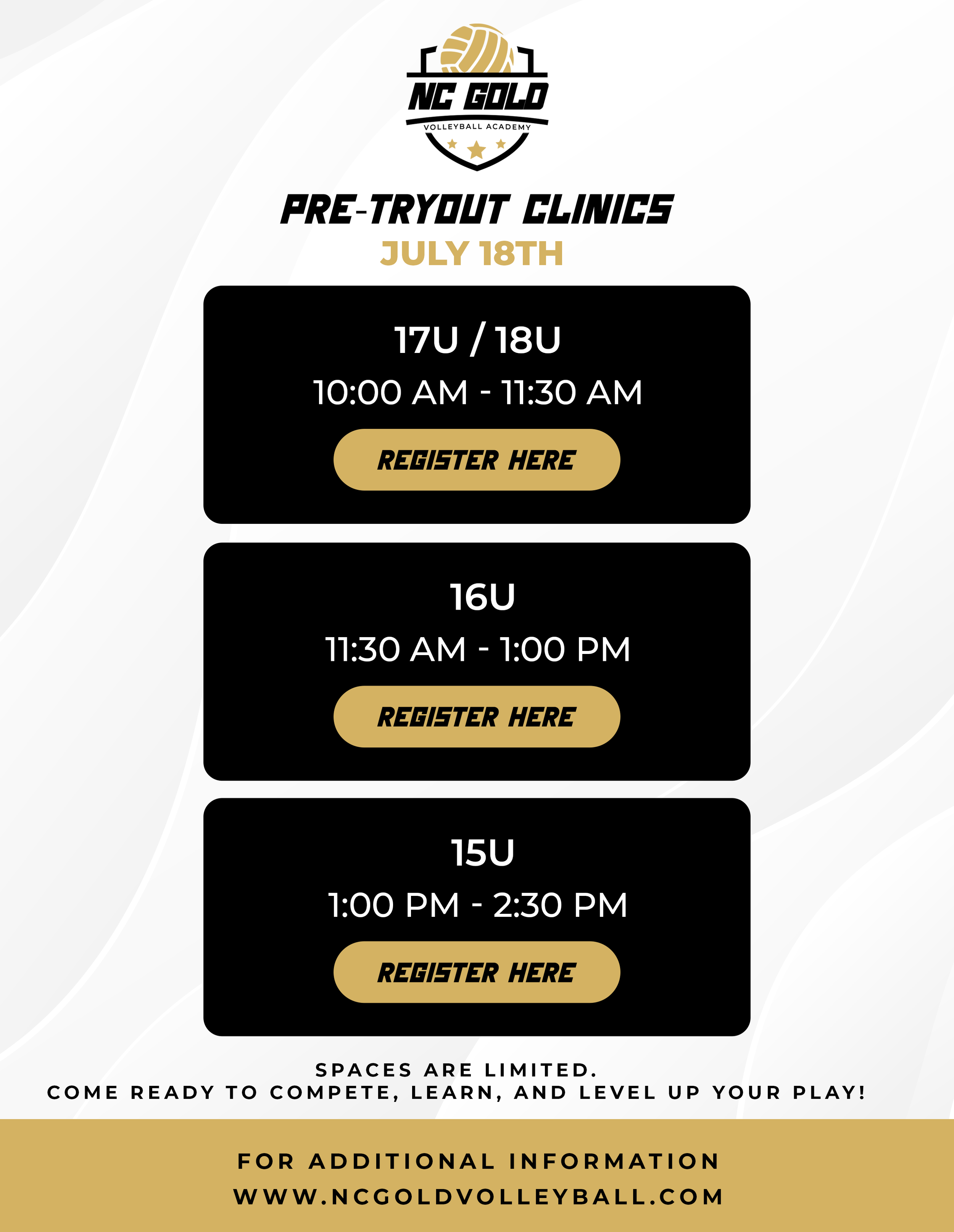 Charlotte's #1 answer to quality instruction, challenging competition, and wholesome recreational activity for ALL athletes at ALL levels. Come on HOME friends and neighbors NC GOLD VOLLEYBALL welcomes you.